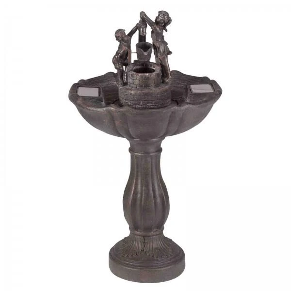 Dit originele vogelbad heeft een in het oog springende waterval waarvan de pomp gevoed wordt door zonne-energie dankzij de twee ingebouwde solarpanelen.