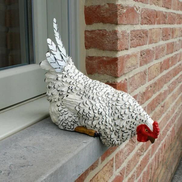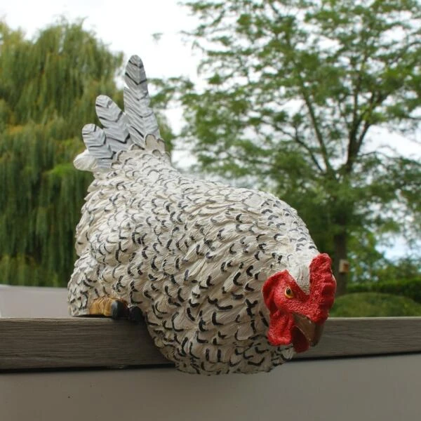 Deze leuke nieuwsgierige kip gluurt over de rand van je tuintafel of keukenkast. De decoratieve kip is gemaakt uit polyresin en kan zowel binnen als buiten staan.