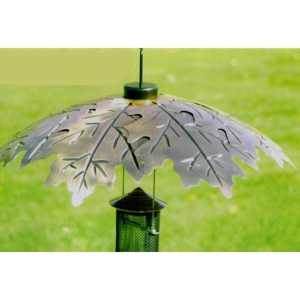 Vogels eten graag op een droge plek, beschut tegen regen, sneeuw en hagel. Dit schild van decoratieve metalen bladeren vormt een paraplu waaronder vogels droog en beschut kunnen eten. De mooie kap wordt geleverd met een sterke dubbele haak waarvan 1 haak bovenaan de kap voor bevestiging aan een tak of touw en 1 haak onder de kap voor de zadenvoedersilo, de pindahouder of het voederelement naar keuze.
