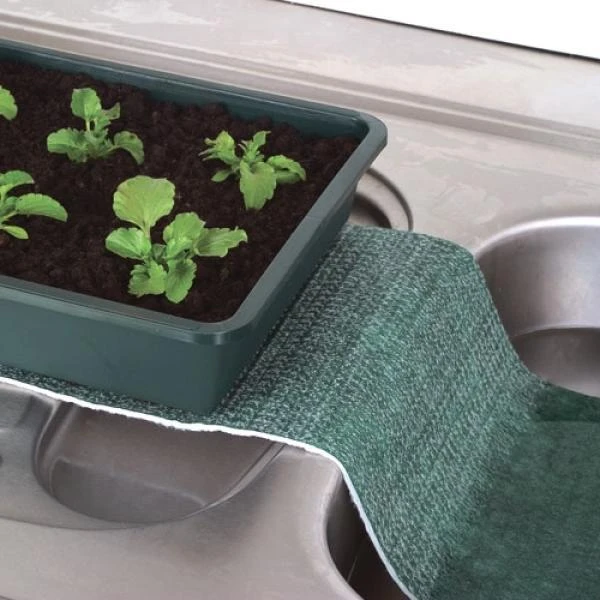 Capillaire mat voor het water geven of het gelijkmatig bewateren van planten en zaailingen in potten of trays. De mat wordt geleverd met een zwarte waterhoudende onderlaag in polyethyleen voor het gebruik in tuinkassen. Deze mat is ook uitermate geschikt voor het vochtig houden van kamerplanten tijdens een periode van afwezigheid.